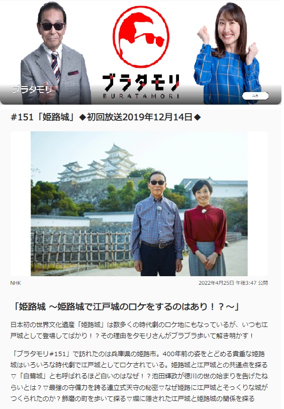 2019年12月14日(土)に放映されたNHKの人気番組「ブラタモリ」では、姫路城と飾磨の町がロケ地となりました。 タモリさんは「宮堀橋交差点」を出発し、宮堀川に架かる「御幸橋」を渡り、「知宝寺」前を右に曲がり、「野田川防潮水門」あたりで対岸の「向島」を見て北上し、「向島橋」で野田川を渡り、「十全商会姫路工場」へ。十全商会姫路工場は、池田輝政の御屋形船海軍工場跡地です。