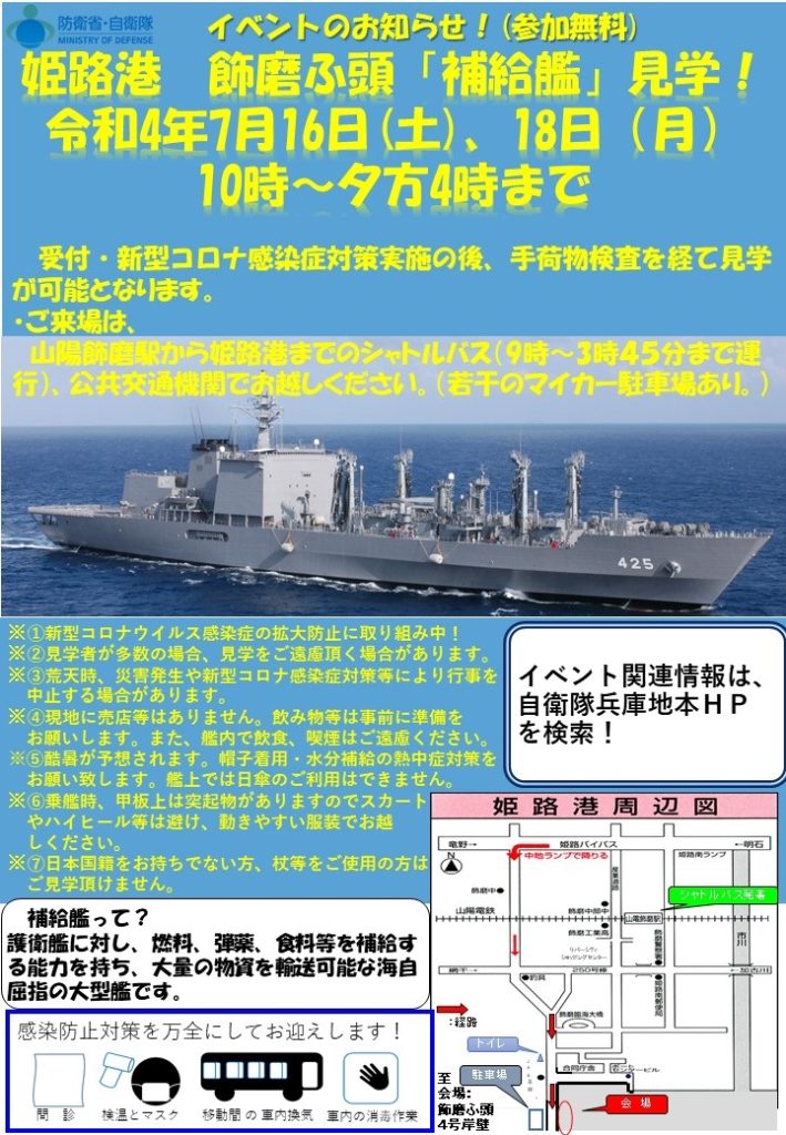 2022年7月12日 / 最終更新日時 : 2022年7月12日 shikamatsu-com 飾磨津のイベント 姫路港 飾磨埠頭に海上自衛隊 補給艦「ましゅう」が寄港 7月16日(土)・18日(月・祝)にイベント 姫路港 飾磨埠頭 4号岸壁に海上自衛隊 補給艦「ましゅう」が寄港し、7月16日(土)と7月18日(月・祝)に乗艦しての見学イベントが開催されるそうです。 海上自衛隊補給艦 ましゅう イベント 出典:海上自衛隊ホームページ コメントを残す コメントをキャンセルメールアドレスが公開されることはありません。 ※ が付いている欄は必須項目ですコメント ※ 名前 ※ メール ※ サイト 次回のコメントで使用するためブラウザーに自分の名前、メールアドレス、サイトを保存する。 上に表示された文字を入力してください。 Δ