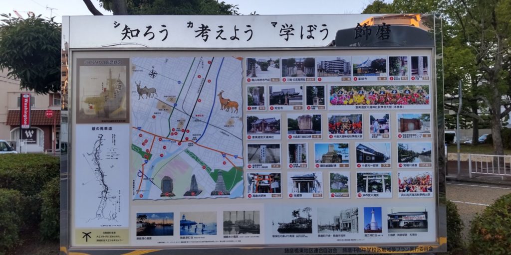 山陽電鉄飾磨駅北側のロータリー内に、飾磨中部中学校区地域夢プラン実行委員会が設置された看板があります。飾磨津の歴史に関連するスポットが掲載されていますので是非ご注目を!